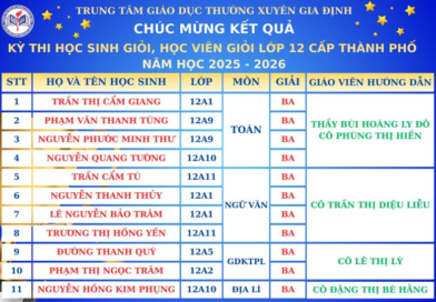 Chúc mừng Quý Thầy Cô và các em học sinh Trung tâm GDTX Gia Định đã đạt 11 giải Học sinh Giỏi, Học viên Giỏi khối 12 cấp TP.HCM năm học 2025 – 2026
