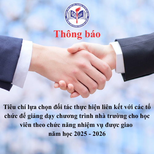 Thông báo tiêu chí lựa chọn đối tác thực hiện liên kết với các tổ chức để giảng dạy chương trình nhà trường cho học viên theo chức năng nhiệm vụ được giao năm học 2025 – 2026 30 Tháng 9, 202524 Views 309_1. TB tiêu chí lựa chọn đối tác thực hiên liên kết giảng dạyTải xuống
