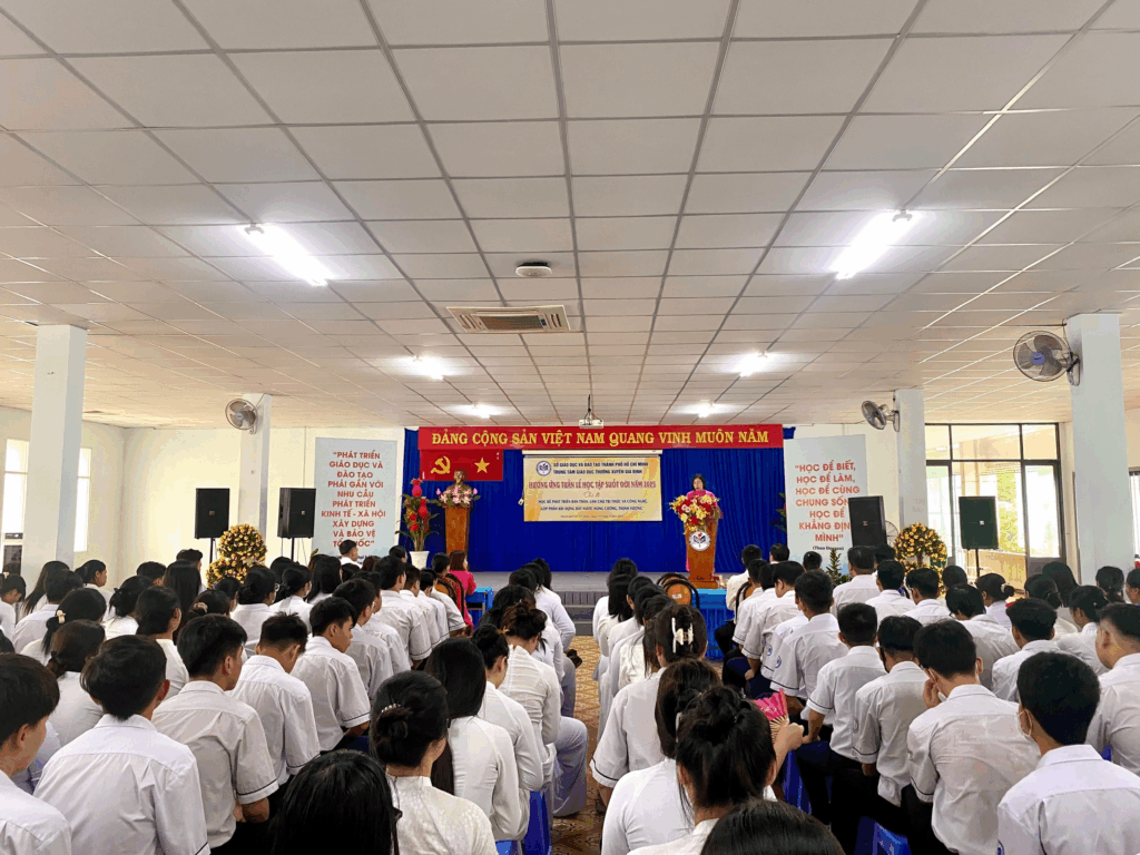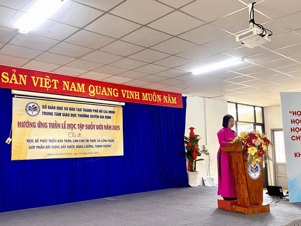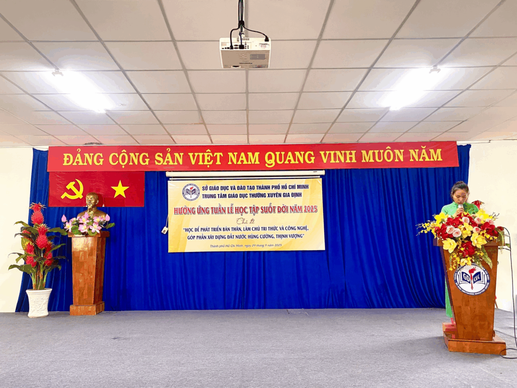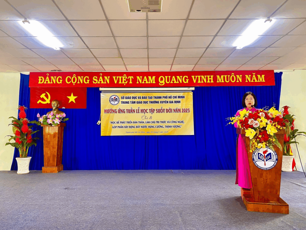 Sáng ngày 29/9/2025, Trung tâm Giáo dục thường xuyên Gia Định tổ chức Lễ phát động Tuần lễ hưởng ứng học tập suốt đời 2025 với chủ đề: “Học để phát triển bản thân, làm chủ tri thức và công nghệ, góp phần xây dựng đất nước hùng cường, thịnh vượng”. Buổi lễ có sự tham dự của cô Hà Ngọc Minh Thi-Giám đốc và thầy Đặng Huỳnh Quốc Tuấn – Phó Giám đốc Trung tâm cùng toàn thể giáo viên và hơn 300 học viên các lớp.