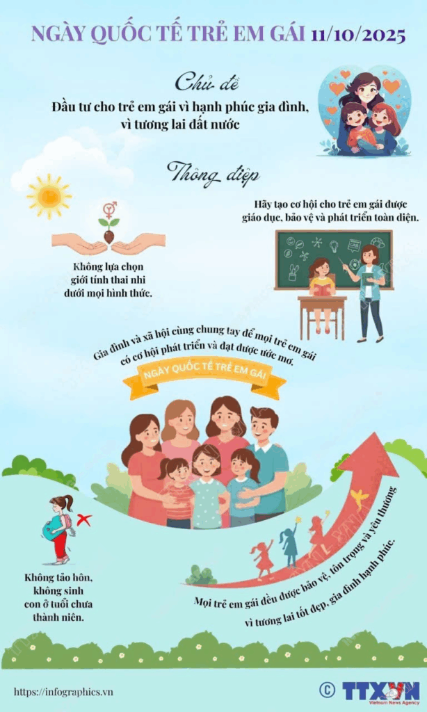 Ngày 11/10 hằng năm được Liên Hợp Quốc chọn là Ngày Quốc tế Trẻ em gái, nhằm tôn vinh giá trị, vai trò của trẻ em gái và kêu gọi cộng đồng quan tâm, tạo điều kiện tốt nhất để các em được học tập, phát triển toàn diện, sống an toàn và hạnh phúc. Năm 2025, với chủ đề “Đầu tư cho trẻ em gái vì hạnh phúc gia đình, vì tương lai đất nước”, ngày Quốc tế Trẻ em gái là lời nhắc nhở mỗi gia đình, nhà trường và toàn xã hội hãy cùng chung tay hành động để đảm bảo mọi trẻ em gái đều được tôn trọng, yêu thương, được học hành, được chăm sóc sức khỏe và có cơ hội phát triển bình đẳng như các bạn nam.