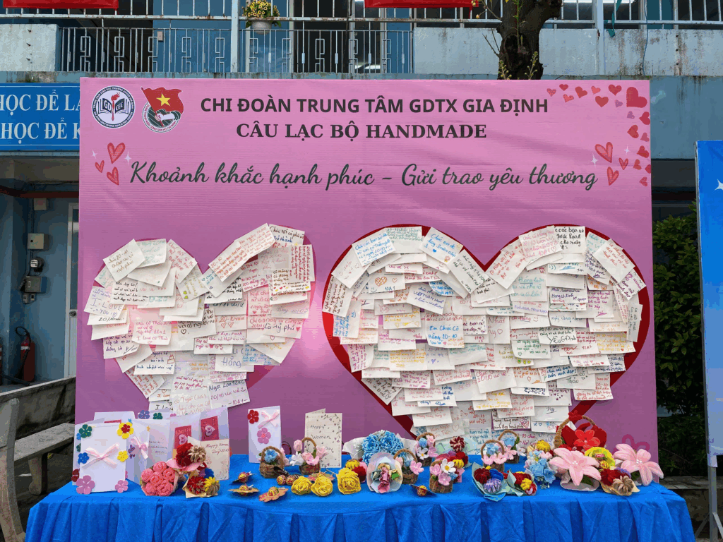 Đặc biệt, Câu lạc bộ Handmade cũng góp thêm sắc màu cho sân trường bằng những bông hoa giấy, hoa kẽm nhung, những chiếc thiệp kèm những lời chức ngọt ngào và thông điệp chân thành – do chính tay các bạn tỉ mỉ tạo nên. ![]()