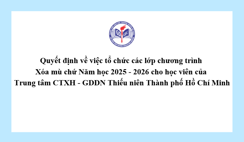 Quyết định về việc tổ chức các lớp chương trình Xóa mù chữ Năm học 2025 – 2026 cho học viên của Trung tâm CTXH – GDDN Thiếu niên Thành phố Hồ Chí Minh 23 Tháng 10, 202517 Views 343_QĐ tổ chức lớp XMC NH 2025-2026Tải xuống