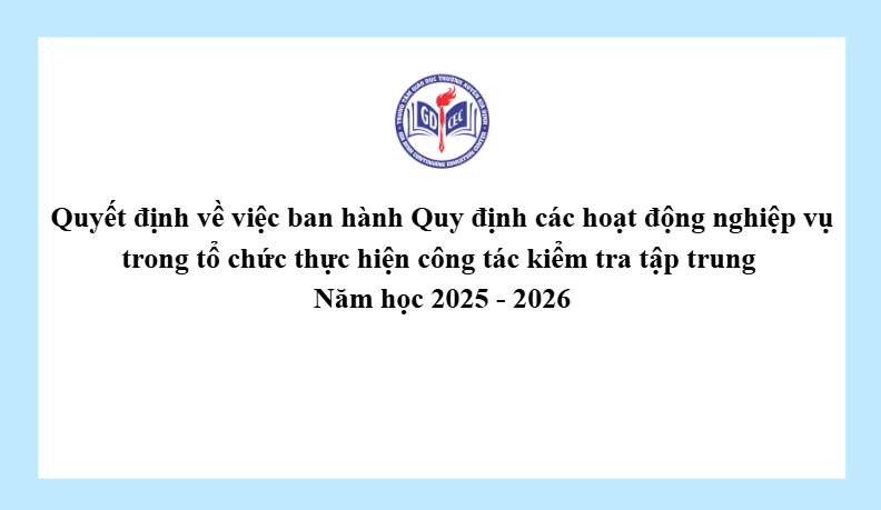 Quyết định về việc ban hành Quy định các hoạt động nghiệp vụ trong tổ chức thực hiện công tác kiểm tra tập trung – Năm học 2025 – 2026 24 Tháng 10, 202542 Views 349_Về Quyết định ban hành Công tác tổ chức thực hiện công tác kiểm tra tập trung Năm học 2025 – 2026Tải xuống 349_Quy định hoạt động nghiệp vụ trong tổ chức thực hiện công tác kiểm tra tập trung Năm học 2025 – 2026Tải xuống