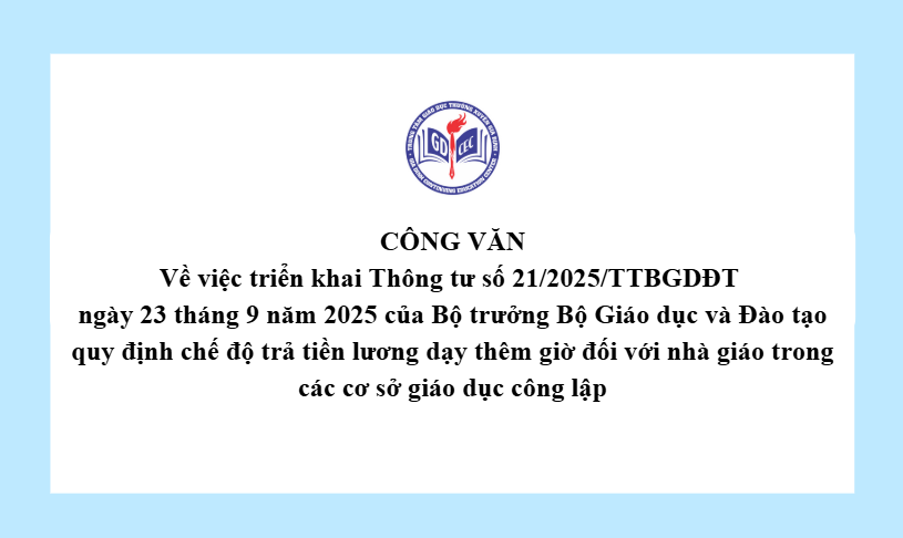 Công văn Về việc triển khai Thông tư số 21/2025/TTBGDĐT ngày 23 tháng 9 năm 2025 của Bộ trưởng Bộ Giáo dục và Đào tạo quy định chế độ trả tiền lương dạy thêm giờ đối với nhà giáo trong các cơ sở giáo dục công lập 14 Tháng mười một, 20254 Views 4348_VB TrienKhai TT21 CTTải xuống TT21_2025_TT-BGDDT_Chế độ trả tiền lương dạy thêm giờTải xuống
