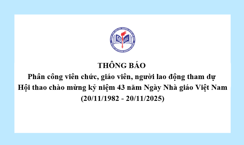 Thông báo Phân công viên chức, giáo viên, người lao động tham dự Hội thao chào mừng kỷ niệm 43 năm Ngày Nhà giáo Việt Nam (20/11/1982 – 20/11/2025) 14 Tháng mười một, 202513 Views GD-TB phan cong VC-GV-NLD tham du Hoi thao 20.11Tải xuống