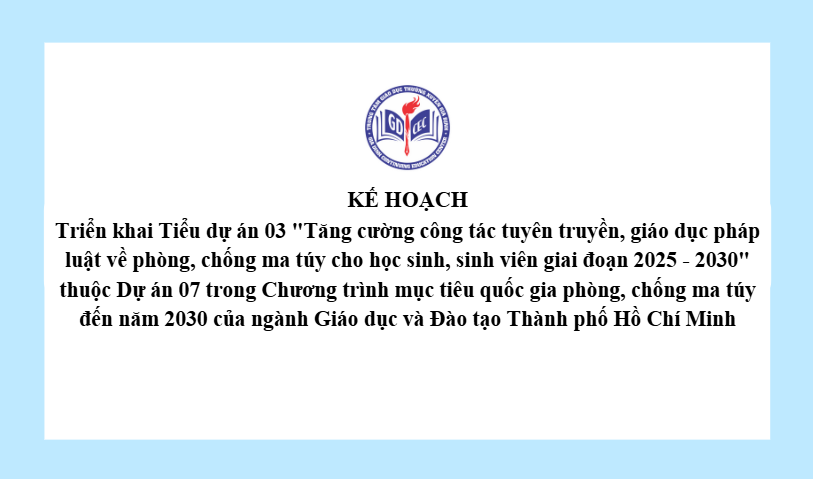 Kế hoạch Triển khai Tiểu dự án 03 “Tăng cường công tác tuyên truyền, giáo dục pháp luật về phòng, chống ma túy cho học sinh, sinh viên giai đoạn 2025-2030” thuộc Dự án 07 trong Chương trình mục tiêu quốc gia phòng, chống ma túy đến năm 2030 của ngành Giáo dục và Đào tạo Thành phố Hồ Chí Minh