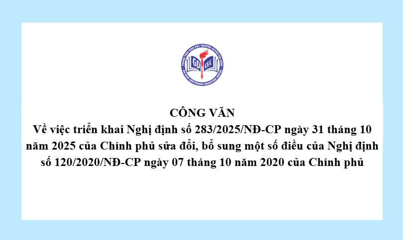 Công văn Về việc triển khai Nghị định số 283/2025/NĐ-CP ngày 31 tháng 10 năm 2025 của Chính phủ sửa đổi, bổ sung một số điều của Nghị định số 120/2020/NĐ-CP ngày 07 tháng 10 năm 2020 của Chính phủ 27 Tháng mười một, 20254 Views 4987_CV triển khai NĐ 283Tải xuống 283_2025_ndcp_31102025signedTải xuống