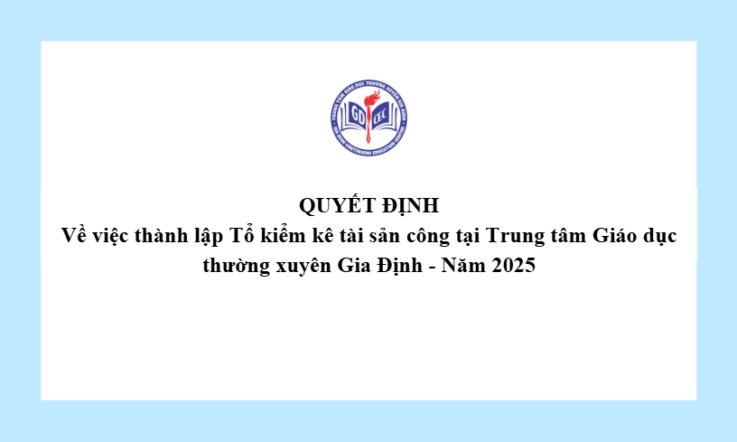 Quyết định về việc thành lập Tổ kiểm kê tài sản công tại Trung tâm Giáo dục thường xuyên Gia Định – Năm 2025 12 Tháng 12, 202588 Views QĐ về thành lập Tổ kiểm kê tài sản công năm 2025Tải xuống