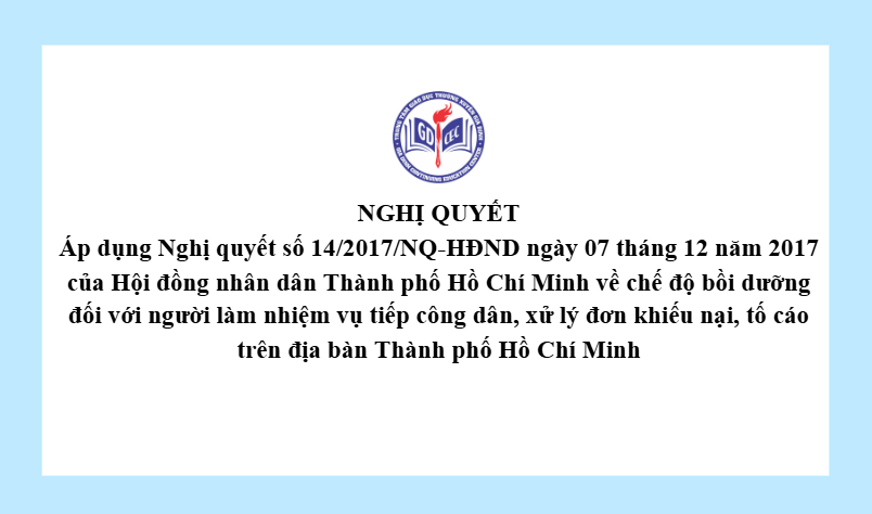 Nghị quyết Áp dụng Nghị quyết số 14/2017/NQ-HĐND ngày 07 tháng 12 năm 2017 của Hội đồng nhân dân Thành phố Hồ Chí Minh về chế độ bồi dưỡng đối với người làm nhiệm vụ tiếp công dân, xử lý đơn khiếu nại, tố cáo trên địa bàn Thành phố Hồ Chí Minh