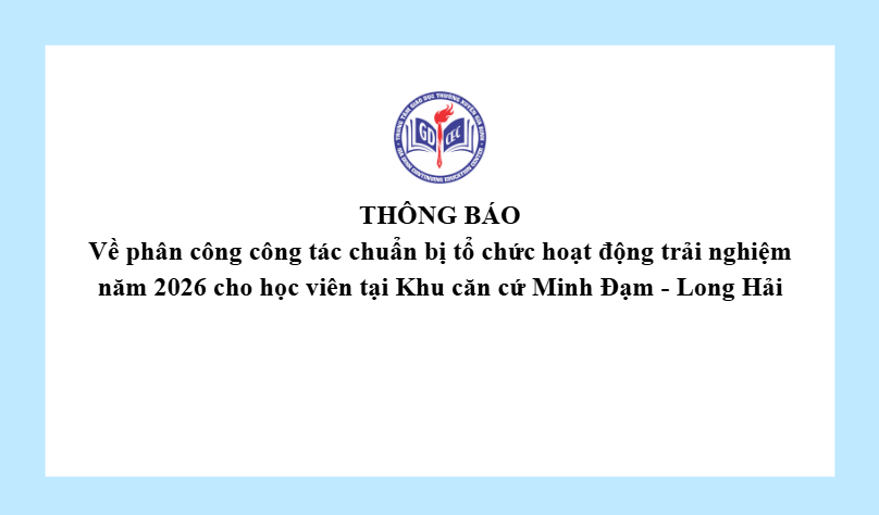 Thông báo Về phân công công tác chuẩn bị tổ chức hoạt động trải nghiệm năm 2026 cho học viên tại Khu căn cứ Minh Đạm – Long Hải 15 Tháng 1, 20261 Views 19_GD-TB phan cong chuan bi hoat dong trai nghiem tai Minh Dam-Long HaiTải xuống