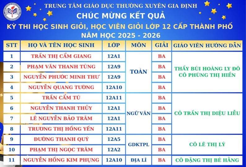 Chúc mừng Quý Thầy Cô và các em học sinh Trung tâm GDTX Gia Định đã đạt 11 giải Học sinh Giỏi, Học viên Giỏi khối 12 cấp TP.HCM năm học 2025 – 2026 14 Tháng 3, 20266 Views