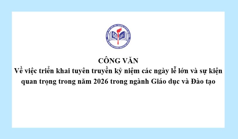 Công văn về việc triển khai tuyên truyền kỷ niệm các ngày lễ lớn và sự kiện quan trọng trong năm 2026 trong ngành Giáo dục và Đào tạo 31 Tháng 3, 20262 Views 2368_2026.03.04 – SGD- Trien khai – Các ngày lễ lớn năm 2026Tải xuống 2368-.1.CV hướng dẫn tuyên truyền ngày lễ 2026.signed.signedTải xuống 2368=Ve_tk_thuc_hien_HD_45_signedTải xuống 2368-41. HD Kỷ niệm 2026 của BTGTWTải xuống 2368-HD của ban TUYÊN TRUYỀN NGÀY LỄ 2026Tải xuống 2368-1322 VPPTU chuyển BTGTUTải xuống