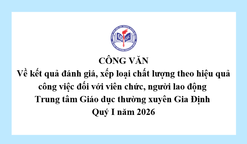 Thông báo Về kết quả đánh giá, xếp loại chất lượng theo hiệu quả công việc đối với viên chức, người lao động Trung tâm Giáo dục thường xuyên Gia Định Quý I năm 2026 3 Tháng 4, 202623 Views 118_TB kết quả đánh giá, xếp loại chất lượng VCNLĐ theo hiệu quả công việc Quý 1 năm 2026Tải xuống 118_QUÝ 1-2026 MẪU 5C NLĐ 111 THỰC HIỆN CÔNG TÁC HỖ TRỢ, PHỤC VỤTải xuống 118_QUÝ 1-2026 MẪU 5A CÁC PHÒNG CHUYÊN MÔNTải xuống 118_QUÝ 1-2026 MẪU 5B CÁC PHÒNG CHUYÊN MÔNTải xuống