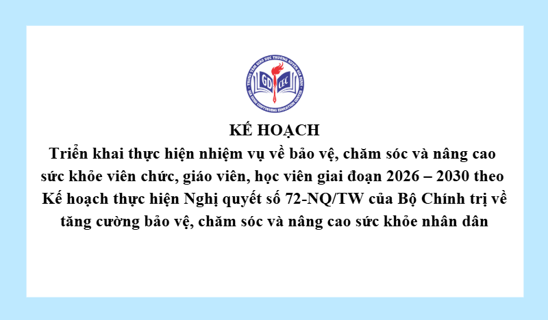 Kế hoạch Triển khai thực hiện nhiệm vụ về bảo vệ, chăm sóc và nâng cao sức khỏe viên chức, giáo viên, học viên giai đoạn 2026 – 2030 theo Kế hoạch thực hiện Nghị quyết số 72-NQ/TW của Bộ Chính trị về tăng cường bảo vệ, chăm sóc và nâng cao sức khỏe nhân dân