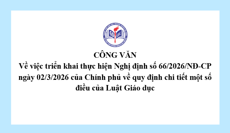 Công văn về việc Triển khai thực hiện Nghị định số 66/2026/NĐ-CP ngày 02/3/2026 của Chính phủ về quy định chi tiết một số điều của Luật Giáo dục 15 Tháng 4, 20264 Views 2890_CV.TrienkhaiNĐ66veluatgiaoducTải xuống 66_2026_ND-CP_02032026Tải xuống