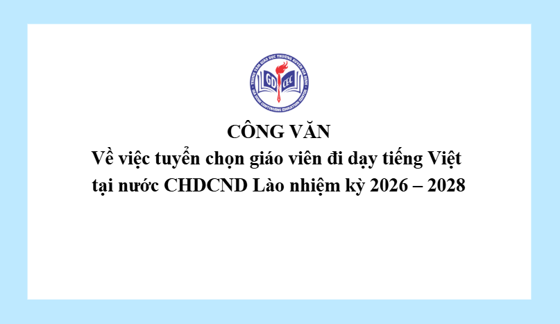 Công văn về việc tuyển chọn giáo viên đi dạy tiếng Việt tại nước CHDCND Lào nhiệm kỳ 2026 – 2028 21 Tháng 4, 20262 Views 3430_CV tuyển GV đi Lào.signedTải xuống 01042026_Ve_tuyen_dung_giao_vien_di_day_tai_Lao_signedTải xuống 497-TB-BGDDTsigned-1Tải xuống CV 6941 UBND TPTải xuống