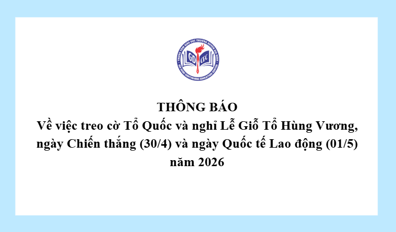 Thông báo Về việc treo cờ Tổ Quốc và nghỉ Lễ Giỗ Tổ Hùng Vương, ngày Chiến thắng (30/4) và ngày Quốc tế Lao động (01/5) năm 2026 24 Tháng 4, 20266 Views 161_TB về treo cờ Tổ Quốc và nghỉ Lễ Giỗ tổ Hùng Vương và Ngày lễ chiến thắng 30-4, Quốc tế Lao động 01-5 năm 2026Tải xuống 161_DS phân công trực Lễ Giỗ tổ Hùng Vương 10-3, Lễ chiến thắng 30-4 và Quốc tế Lao động 01-5 năm 2026Tải xuống