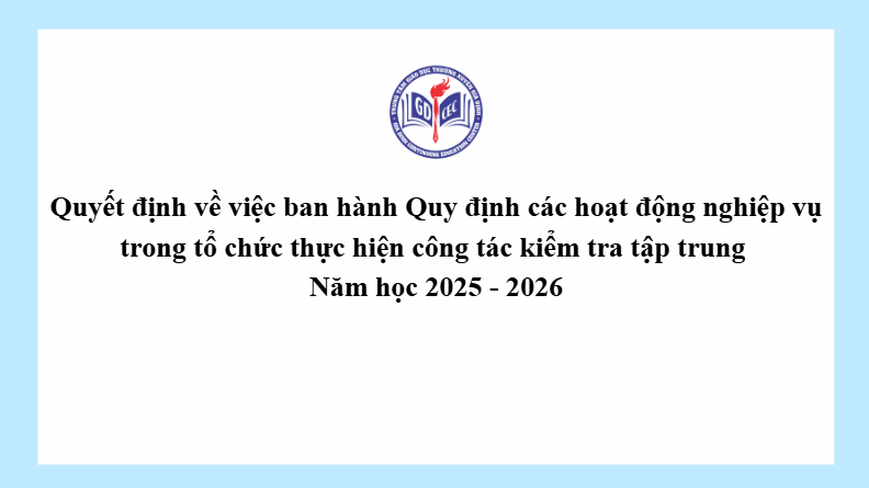 Quyết định về việc ban hành Quy định các hoạt động nghiệp vụ trong tổ chức thực hiện công tác kiểm tra tập trung – Năm học 2025 – 2026 24 Tháng 10, 202521 Views Xem thêm