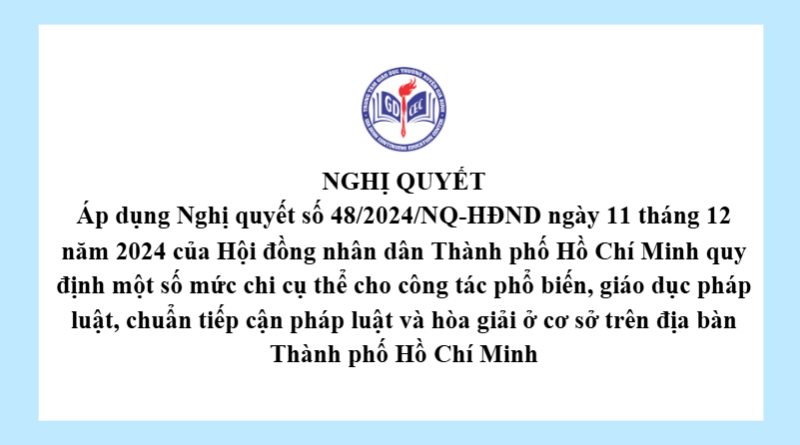 Nghị quyết Áp dụng Nghị quyết số 48/2024/NQ-HĐND ngày 11 tháng 12 năm 2024 của Hội đồng nhân dân Thành phố Hồ Chí Minh quy định một số mức chi cụ thể cho công tác phổ biến, giáo dục pháp luật, chuẩn tiếp cận pháp luật và hòa giải ở cơ sở trên địa bàn Thành phố Hồ Chí Minh 7 Tháng 1, 202612 Views Xem thêm