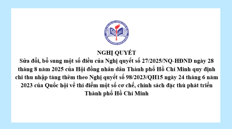 Nghị quyết Sửa đổi, bổ sung một số điều của Nghị quyết số 27/2025/NQ-HĐND ngày 28 tháng 8 năm 2025 của Hội đồng nhân dân Thành phố Hồ Chí Minh quy định chi thu nhập tăng thêm theo Nghị quyết số 98/2023/QH15 ngày 24 tháng 6 năm 2023 của Quốc hội về thí điểm một số cơ chế, chính sách đặc thù phát triển Thành phố Hồ Chí Minh 7 Tháng 1, 202617 Views Xem thêm