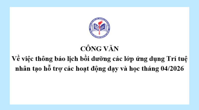 Công văn về việc thông báo lịch bồi dưỡng các lớp ứng dụng Trí tuệ nhân tạo hỗ trợ các hoạt động dạy và học tháng 04/2026 30 Tháng 3, 202615 Views Xem thêm