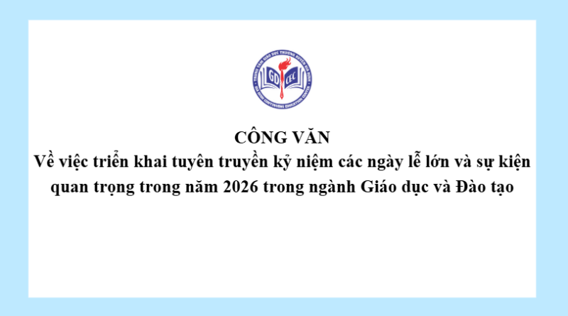 Công văn về việc triển khai tuyên truyền kỷ niệm các ngày lễ lớn và sự kiện quan trọng trong năm 2026 trong ngành Giáo dục và Đào tạo 31 Tháng 3, 20268 Views Xem thêm