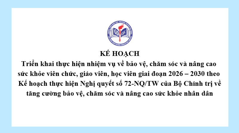 Kế hoạch Triển khai thực hiện nhiệm vụ về bảo vệ, chăm sóc và nâng cao sức khỏe viên chức, giáo viên, học viên giai đoạn 2026 – 2030 theo Kế hoạch thực hiện Nghị quyết số 72-NQ/TW của Bộ Chính trị về tăng cường bảo vệ, chăm sóc và nâng cao sức khỏe nhân dân 6 Tháng 4, 20266 Views Xem thêm